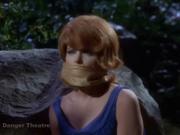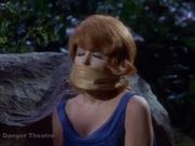 Tina Louise plays Ginger Grant who is overcome bound and gagged by her evil twin Eva Grubb (also played by Tina Louise), who has decided to take her place in Hollywood and leave Ginger trapped on the island forever. She invites ginger to an isolated spot on the island for some girl talk but instead knocks her on the head and leaves her kneeling tied hand and foot and gagged with a brown scarf. Ginger escapes and reveals the truth to the other Castaways.
