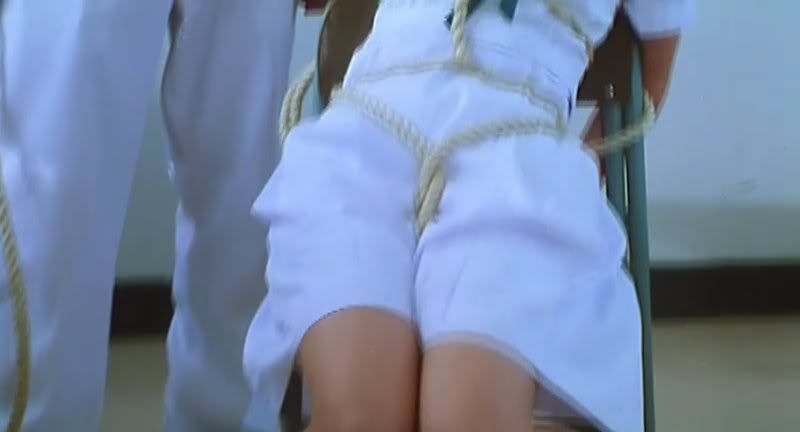 In this Hong Kong action comedy, an undercover cop tries to protect a rich girl (played by Ceci Tse) from kidnappers, near as I can guess anyway. First, he gets into a mock fight with her over a sharp metal compass, which winds up stuck in his leg. She winds up tied to a chair with a red candle on top of her head (don't ask.) Later real kidnappers show up and tie up the cop's partner with the girl's teacher (played by King-Tan Yuen) and hustle the girl away bound and gagged. the cop stops them and even dodges bullets Matrix style. The girl is again hustled away to end up in a science lab, tied to chair, gagged with the room filling with butane gas from the Bunsen burners.