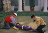 In this clip, Batgirl , played by Yvonne Craig is captured by Joker and Catwoman and trussed up with special deadly twine that contracts under body heat.
