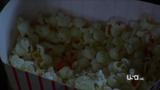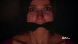 The infamous Yin-Yang killer returns, intent on testing Shawn's detective abilities with his twisted poems and games. First a waitress disappears (played by Emma Lahana), and after following the clues, the police discover a photo in Shawn's apartment of the hapless girl wide-eyed, tied to a chair and cleave gagged. They find her later on, still bound and gagged, but unconscious with an note from the killer crammed in her mouth behind her black scarf gag. The killer has kidnapped Shawn's mother (played by Cybill Shepard!). We discover her at a local drive-in, presumably bound in her seat, a laser sight aimed at the back of her head, a flesh-colored tape gag sealing her mouth. The laser sight is a fake, but the bomb in mom's lap hidden in the popcorn bag is very real and the killer has the remote detonator.
