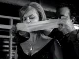 In this clip, Honey West (played by the gorgeous Anne Francis) and her companion are captured by members of 'the syndicate' during a formal gala. After an expositional tour of the crooks' operations inside the mansion, the pair are gagged and fastened to chairs mounted inside a pair of shipping crates to be sent to Venezuela . Honey's other assistant finally springs into action to save her and after her crate falls out of the moving truck, she frees herself and joins the fray. Later, Honey and he are seen listening to clip of the evidence tape they'll use against the gang (which just so happens to be Honey being gagged.)