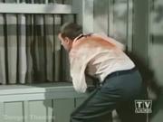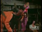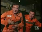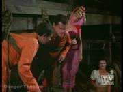 After a mishap with their experimental spacecraft leave Majors Melson and Healey crash-landed in the backwoods and captured by Hillbillies who believe they are Martians, Jeannie (played of course by Barbara Eden) makes a rescue attempt and promptly knocks herself unconscious by stepping on a rake. Jeannie is bound and strung up alongside the Majors. In the meantime, Daisy Lou (played by Lisa Gaye) has taken a shine to Major Healey and the boys use her newfound love to talk her into untying them - so they can quickly turn the tables on her leaving her hanging tied up and gagged with a big red bandanna. The guys haul the unconscious Jennie away.
