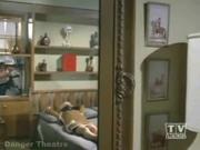 In this clip, Jeannie is tricked into going into her bottle by her wicked twin sister (both played by Barbra Eden in a dual role) and trapped there so she can assume Jeannie's identity and steal Major Nelson from her. Later, when Major Healey comes snooping around after returning from a forced trip aboard (also for snooping around) Jeannie II blinks herself so he'll believe that it's the true Jeannie gagged and tied to the bed.