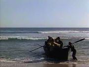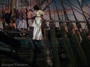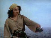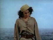 In this classic pirate movie, beautiful Debra Paget plays Molly LaRochelle, who finds herself the victim of a pirate woman's scorn after her husband's liaison with the her. Molly is kidnapped by the pirates and Captain Anne Providence tries to sell Molly in the Arabian slave market, but the timely arrival of Molly's husband's ship, guns firing in the harbor no less, turns the marketeers against her and she's forced to return to her ship. There, poor Molly is tied to the rigging as a human shield to keep the other ship at bay while the pirates rip it to shreds with cannons and Molly's husband is likewise captured. Driven by jealousy, Captain Providence decides to abandon the lovers on a desert island with no food or water, but one of her crew talks her into going back and leaving them a supplied longboat with maps and compass (not shown).