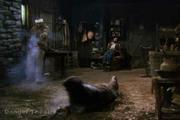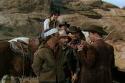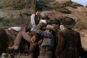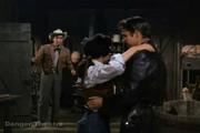 In this classic western film, Susan Cabot plays Jane "Dusty" Fargo who gets suckered into bringing an outlaw's henchman back to his boss whose been masquerading as a bounty hunter. At their camp, Dusty is nabbed and held prisoner in a cabin as the Marshall and his posse are closing in. A huge gunfight breaks out during which our hero spies Dusty's horse tethered at the cabin and recklessly rides down and throws himself bodily through a window. Inside, Dusty is tied to a chair and gagged with a bandanna. Our hero guns down the man watching over her. As the smoke clears and the surviving baddies are arrested, the Marshall finds Dusty and our hero in a tender moment and wisely leaves them to it.