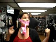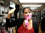 Silence is golden but bondage tape is silver or pink in the case of this amusing video clip as a woman explains the virtues of bondage tape ad nauseum until a man standing behind her shows her another good use for the stuff.