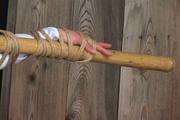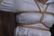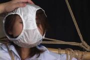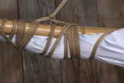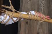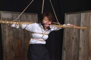 Lastly, we have another clip of our lovely Japanese lady, still in bondage torment as she's tied cruciform over a bamboo rod before receiving a tight blue cleave gag and then a pair of white satin panties are put over her favce, humiliating her.
