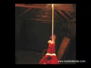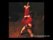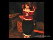 In this short clip model Jezebel dressed in a tight red top and skinny black skirt and heels struggles vigorously tied to a wooden post in the attic wearing harness ball-gag. Next, she's seated arms up strappado style and tied, wearing a red cloth cleave gag. Lastly, she's back on a ground floor cleave gagged with a knotted white cloth and chair bound, in a bosomy gray top and short skirt.