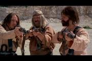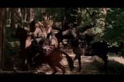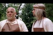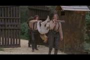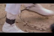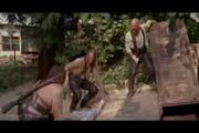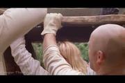 Renee O'Connor plays Kelly and Neda Sokolovoska plays Aida in this Grade-F science fiction movie from the SciFi Channel. Four NASA astronauts return from a deep space probe to discover the earth transformed to a primitive wasteland dotted with tribes under the rule of alien insectoids. The four are quickly captured and gagged by slavers working for the aliens and led away in chains to a saw mill work camp (Aida doesn't make it since she's too slow due to her broken leg and disposed of.) At the camp, Kelly and the others are set to work loading lumber into carts still gagged, and under guard, but not otherwise restrained. Later, Kelly is locked into upright stocks and about to be whipped for laziness which inspires our lantern-jawed hero to spring into action to save her. Their escape is complicated when Kelly and our hero are separated and she is brought down and re-captured by the slavers. They haul her back to camp on a carry pole, cut her loose and dump her into an underground cell under guard.