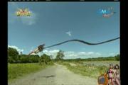 In this clip from the adventures of the Filipino Wonder Woman, Darna (played by Marian Rivera) is attacked by Hawkwoman and Lucifera The Tree Woman, a plant villain that grows to immense size and wraps her up in vines. Darna breaks free, and after Hawkwoman forces our heroine to dodge a volley of metal feathers, the monster tries again but Darna uses the vine to whip HawkWoman out of commission before binding up the plant creature and hauling her into outer space.