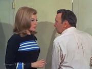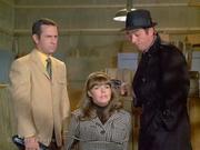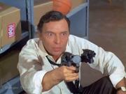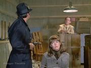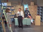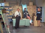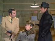 Barbra Feldon returns as Agent 99 whom in this cold opening to the episode is caught by a Kaos agent while snooping in a warehouse in search of a weapons depot, and ends up at gunpoint tied to a chair, but Max intervenes to save her (eventually.) Later, after budget cutbacks at CONTROL force them to fire 99, she takes a job at a green stamp redemption center (which naturally tuns out to be the secret weapon depot) and she's captured again while talking to the Chief via her compact radio. She ends up tied to a surfboard in the storeroom and is later joined by the Chief and Larabee who are both in drag, I mean disguise and tied to a slide. Max shows up in the nick, to pick up 99 from work but the Kaos agent keeps him distracted and so she gets on the shops conveyor belt, kicks it on and alerts Max to what's really happening. In the storeroom, Max is almost captured too, but 99 gives the female Kaos Agent a thump on the head with her surfboard and so Max and the other baddies slug it out.