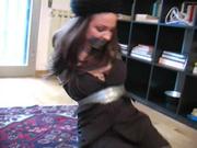 From defunct website Boundtown comes this clip of Gisy dressed in revolutionary-style black, bound from the shoulders down and gagged with lots of shiny silver duct tape, thrashing about for all her worth, but not getting loose.