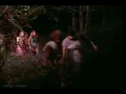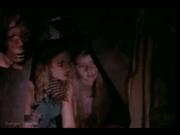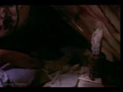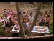 In this extended clip, Robin Lilly plays Cleo Carr in this stupid, violent, poorly made horror movie about a gang of cannibalistic feral kids from Troma Films. In the opening bit, Cleo dashes upstairs to save her niece Kara from the gang before she's carted off and is attacked. She manages to fight the kids off with a baseball bat, but Kara is taken anyway and she gives chase only to be clubbed unconscious. The gang carries her back to camp in the woods where Cleo is tied and hand and foot, gagged with a stick and left in a tent. She wakes up and manages to untie her feet and makes a run for it, only to stumble into the human larder where she's discovered, attacked and re-captured. Later in the movie, our would-be hero is trapped in a barn by the gang and sets a trap to catch one of the kids to use as a bargaining chip. Amy Carr (played by Lorna Courtney) climbs up the ladder and he grabs her. He realizes she's his niece, but she's been brainwashed by the gang. He ties her hands together in front and later gags her with a cloth. He takes her back the gang's hideout, but it's already too late for Cleo.