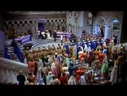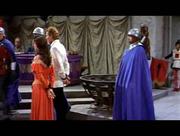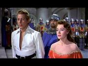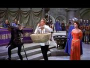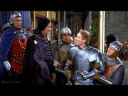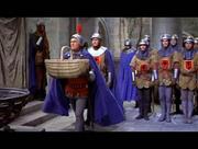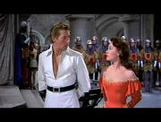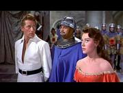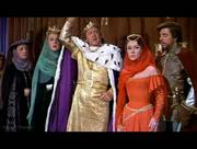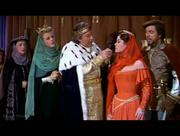 Glynis Johns plays Maid Jean in this rollicking medieval musical comedy. In this scene, Jean and our titular hero are under arrest on accusations of treason to a despotic king. On trial for their lives, the pair stand with their hands tied behind them when a curious looking guard slips up behind them and cuts them free. Above in the rafters, a troupe of acrobatic midgets makes preparations for a rescue.