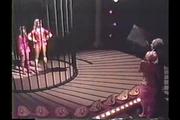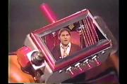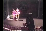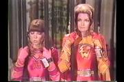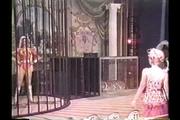 Soap opera veteran Deidre Hall plays Electrawoman and Judy Strangis plays Dynagirl in this classic kids TV superheroine creation by Sid & Marty Kroft. In this bit from the pilot episode, the duo are chasing the newly escaped Sorcerer, who plans to rob Fort Knox but the villain has set a trap using a golden Chinese statue as bait. EW & DG find the statue and are dazzled and teleported by a spinning metal object and find themselves on an old stage with The Sorcerer and Miss Dazzle as the audience. Deep underground, the heroes find they are cut off from the source of their electra-powers and suddenly zapped into a cage, and soon to be facing down a man-eating tiger as the gate between them slowly rises.