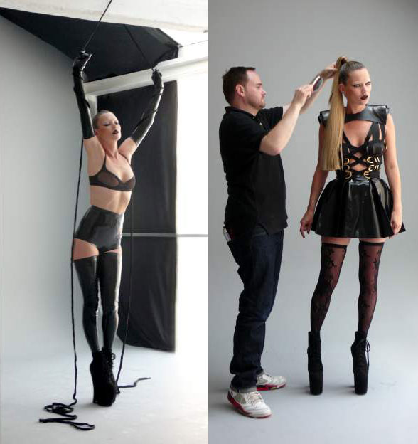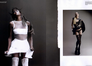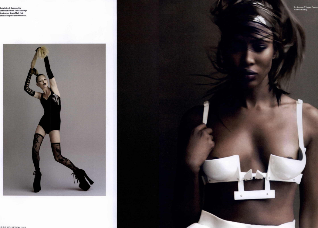 For Campbell, Sam McKnight concocted a wig fit for a snow queen. Edward is twisting the shoot in a slightly more provocative direction, as testified by a table piled high with lacy basques, latex knickers and the kind of strict corsetry much favoured by Allen Jones. Lest we think fetish has the upper hand over fashion, the stand-out stays (quite literally, in those jutting breasts and hips) belong to none less than couture corsetry maestro Thierry Mugler.