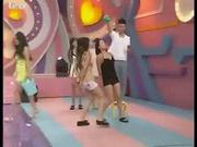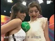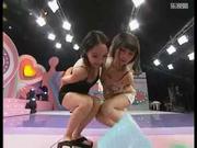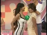 In this game show that "teaches new models to be perfect" *snerk* two different pairs of leggy cuties with their hands zip-tied behind them are given the challenge of catching a rubber ball between them, carry it a distance and drop it into a waste basket, the team gets the most balls in the least time wins.