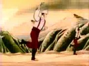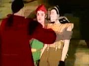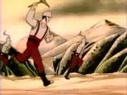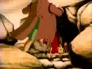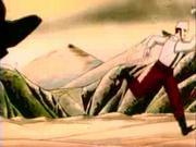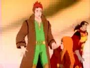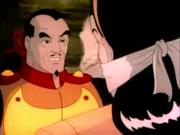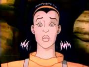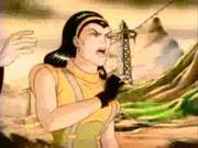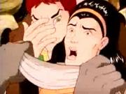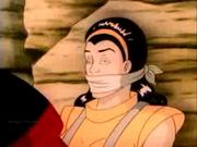 In this episode of the cartoon loosely based on the Highlander franchise set in a post-apocalyptic world, the evil immortal lord has set up our hero as a cruel god figure who demands child sacrifices from his worshipers to incite the people to rebel and hunt him down. In this brief bit, the heroes are forced to briefly capture and gag a local woman to keep her from revealing their location to a rampaging mob.