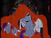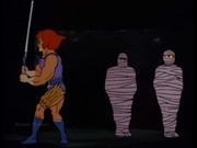 Told in a series of flashbacks, in this episode Snarf must go to the rescue of the Thundercats after they are captured one by one by his gang of mutants, mummified and imprisoned in Mum-ra's tomb. In the first bit, Cheetara rushes to answer a summons by lion-o, but it's a trap and she's caught in a net. Using his ability to talk to animals Snarf has large spider wrap up Mum-ra's sarcophagus in webbing to buy time so he can fetch the Sword of Omens which will give the heroes the energy to escape this trap.