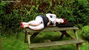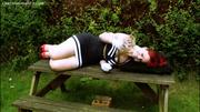 From my generous benefactor and host Limited Audience, ravishing zoftig goth girl Raevan Rose is the subject of this video where she struggle tightly bound and firmly cleave gagged atop a picnic table. Her effort appear in vain, but the girl has the luck and manages to get loose from her tight rope bonds and attempts to flee only to be intercepted by parties unknown....