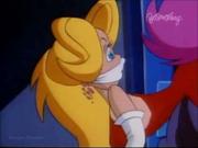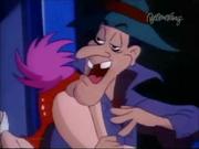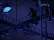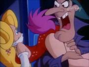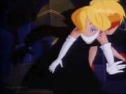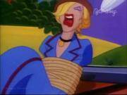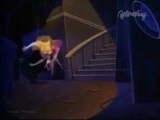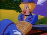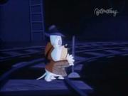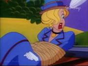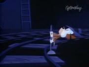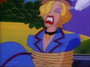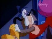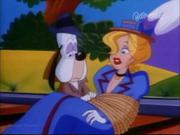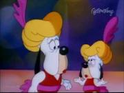 Droopy and his son Drippy are charged with keeping actress Melody Stardust safe on the set of her new movie as she's being stalked by a crazed phantom in the catwalks above the sound stage. In the first bit, Melody is playing the classic damsel tied the railroad tracks, who is supposed to escape the ropes at the last moment before the train cuts her down. Trouble is-- the knots are too tight, and she can't escape, even with Droopy's help. Together he and Drippy toggle the lever controlling the tracks and the train passes safely around her. Afterward, one by one two blond dancers (including our heroine) are snatched off-stage by a hook and we see Melody gagged and slung over the shoulder of a fleeing shadowy figure...