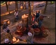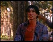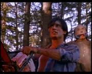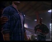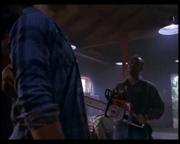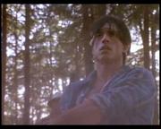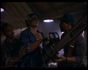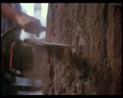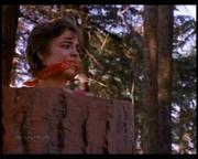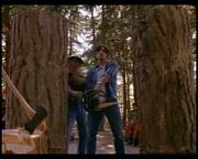 Michelle Johnson plays Liz Kelly-Dixon, the slutty new wife of a wealthy logging camp owner who starts an affair with a worker, which she then blames, triggering her husband's rage. The man is left permanently blind in the attack, but his buddies on the work crew help him out by teaching him how to handle a chainsaw. Toward the story's gory climax, he gleefully slices into one of a pair of thick tree trunks set up for him by his buddies-- one containing his boss, stuffed inside the hollowed out center and gagged, the other soon to be sliced containing Liz, likewise helpless and gagged.