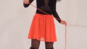 , a lovely girl in a black leotard does an intricate suspension bondage from a metal ring using red rope taken from a small red bag.
