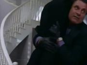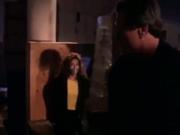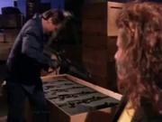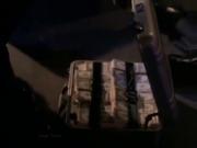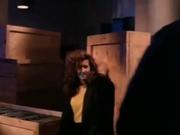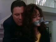 Constance Marie plays Maria who finds herself stuck in an abusive marriage to a well-connected lawyer and asks the Cobra team for help to escape him. In the first bit, he catches her as she's about to pack up and leave their house, grabs her gags her and ties her up with duct tape before carrying her over his shoulder and dumping her in the trunk of his car. The police pull him over for a broken tail light, soon discover Maria in the trunk and arrest him. He gets off on a technicality and has some crooked federal agents kidnap her. At a warehouse she sits on a crate bound and gagged with tape watching as he raids a case for automatic weapons and waits for a copter to come pick them up. Maria meanwhile is surreptitiously cutting the tape around her wrists with the aid of a broken metal band on the crate she's seated on.