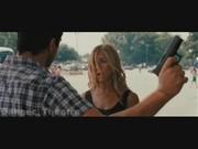 Jennifer Aniston plays Nicole Hurley in the romantic comedy about an investigative reporter following leads on a story about dirty cops involved with drugs, who also has an outstanding warrant for a number of unpaid parking tickets, with her ex-husband as the bounty hunter coming to collect her. In the opening bit, the pair confront each other outside a race track, but Nicole is determined to not be taken in.