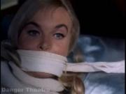 In this clip from the classic TV series about a thief who has turned his talents against criminals, thugs and other ne'er-do-wells, The Saint has been set up by a secret agent so he'll take the blame for the loss of 100,000 British Pounds by a crooked casino owner. Bond Babe Shirley Eaton plays Reb Denning who gets her comeuppance when the crooks catch up to her at her hotel room and leave her bound and gagged on the bed so they can search for the money (neatly stashed in a briefcase in the shower). Fortunately for her, the Saint steps in before things take a nasty turn and the bad guys agree to leave them in peace- with the cash in hand, of course. The Saint then turns his attention to Reb to get some answers, but when her tone turns nasty, he re-gags her for a moment until she's ready to talk sensibly.