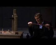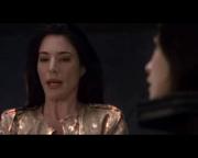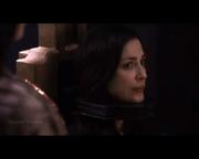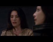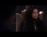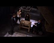 In part two of our 3rd season ending, Myka Bering (played by Joanne Kelly) is forced into a chess game/ death trap which is part of an unusual mechanical key that serves as a Warehouse facility's backdoor. Her neck is locked into a metal brace attached to a stone chair and above her an ax blade attached to system of gears is poised. If she makes the wrong move on the chess board, the ax mechanism rotates closer and closer to splitting her head open. H.G Welles (played by Jaime Murray) helps her make the final move and open the lock, saving her life. Finally, during the final fight-- H.G. Welles and Myka find themselves wrapped together face to face and nearly strangled to death by the animated rope from the Marie Celeste which only tightens if you pull on it. Artie saves the day, however.