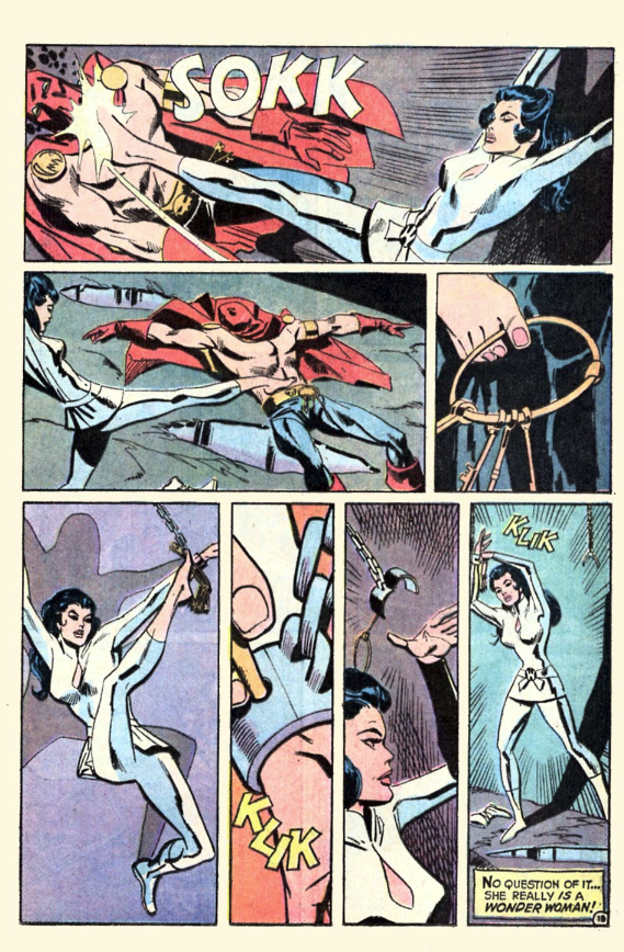 In the 70's the character of Wonder Woman received a secret agent style makeover. Gone were the the invisible plane, the magic lasso, the bracelets and the star spangled bustier. In this tale, Diana and a companion are attacked by a horde of hooded figures after their train is thrown off the tracks. The duo are gassed unconscious, dragged to an underground lair, manacled and put on trial for their lives. Diana's companion convinces the leader to let him go and retrieve a man they are after named Dill, and they keep Diana hostage to ensure his return. She's chained up in a dungeon and later engineers her own escape.
