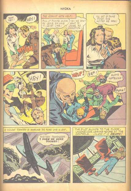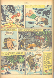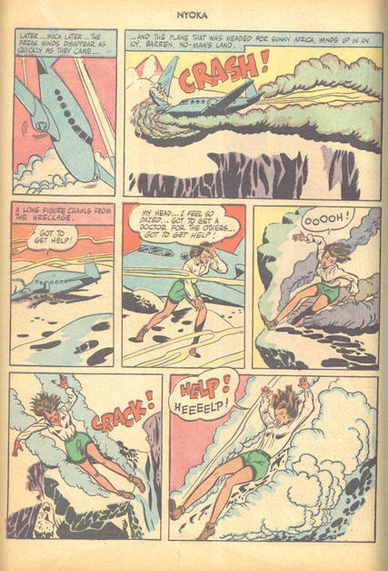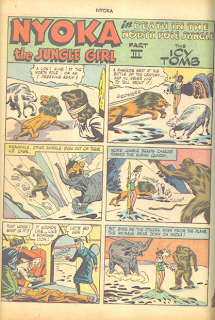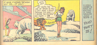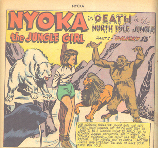 In this story, Nyoka's plane is hijacked by baddies and forced to crash in the frozen north. Nyoka stumbles from the smoldering wreckage in search of aid only to tumble into a chsm where several animals stand frozen in ice. Nyoka is recovered and taken back to the plane, but the baddies get the better of her friends and a weakened heroine is taken back out into the snow, gagged and bound to a tree stump and then they crack the animals out of theit icy shrouds and they immediately attack the only fresh meat in sight-- Nyoka !!