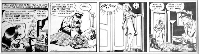In this amusing strip, Mrs. Duncan imagines getting tied to a chair and blindfolded at gunpoint by her teenage son's girlfriend when she arrives to pick him up for a date.