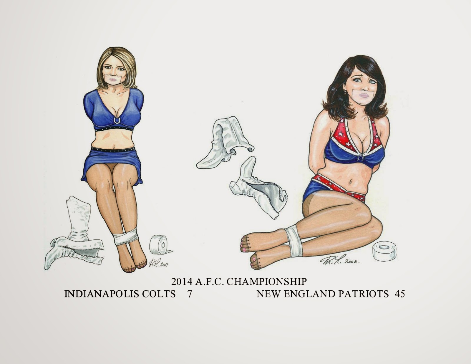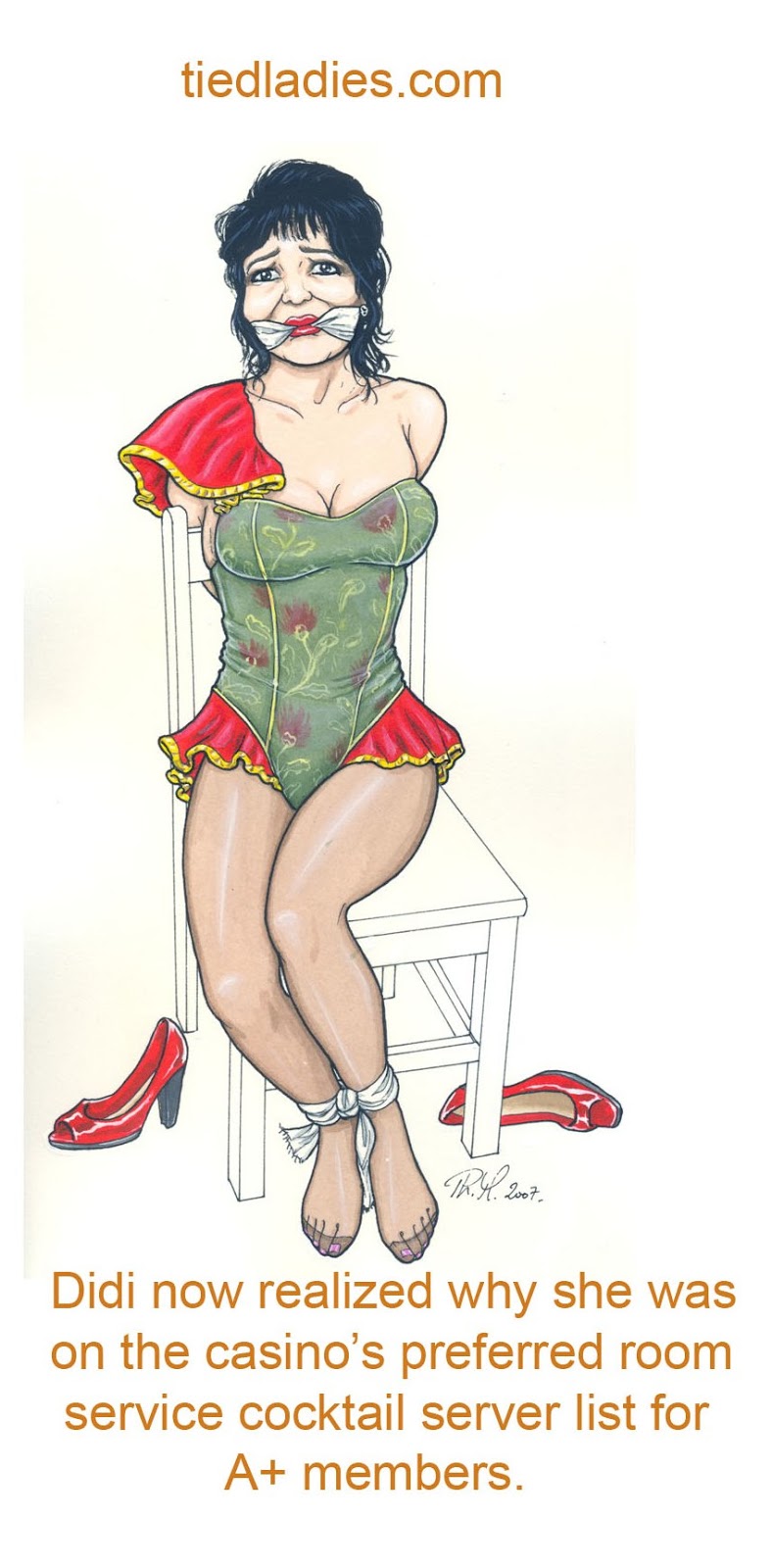 Phm puts a lot a time and energy behind his careful renderings of skirted damsels bound, tape-gagged wide-eyed and in distress. Here are a pair of Cheerleaders in distress. you can see more by clicking here.