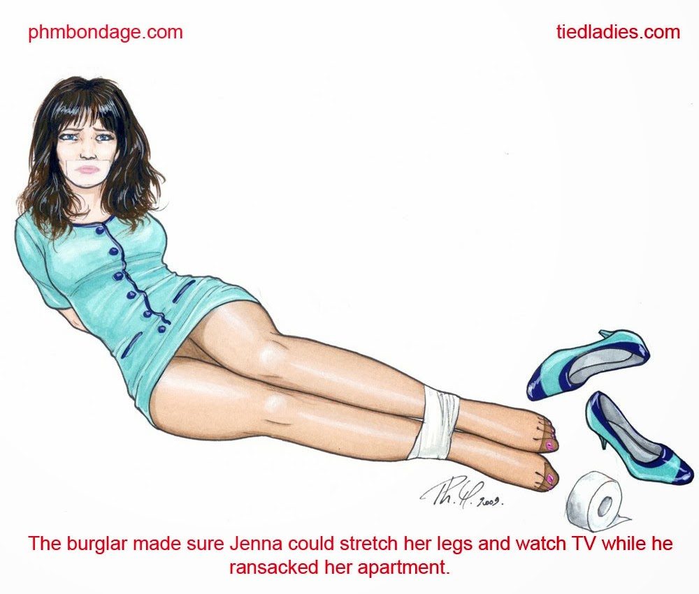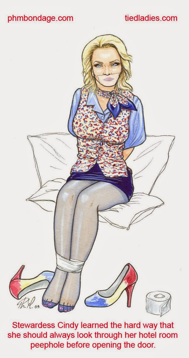 Always a welcome sight in my inbox is some more damsel artwork from the talented PHM, who loves his ladies stocking-footed as well as bound and gagged in tricky situation. In addition to his art, he does pics and video too.